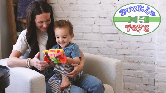 Perfect for travel and stroller adventures, Buckle Toy Squares are the ideal companions for curious toddlers. These cleverly sized squares feature colorful primary tones and a variety of fun buckles to satisfy your child's fascination with snapping and clicking.